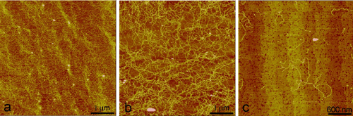 5-mm scan, z-scale 10 nm; (c) 0.02% polysaccharide, 3-mm scan, z-scale
